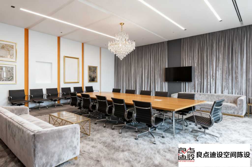 質(zhì)感會議空間: 長條巖板會議桌+皮質(zhì)會議椅(帶金屬腳)+特色吊燈。墻面掛大幅抽象畫或質(zhì)感木飾面,開會都變高級。