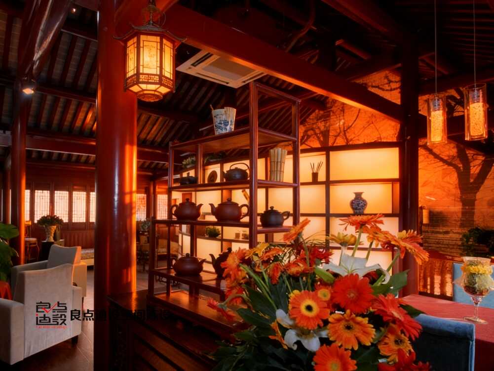 ***吸睛的是遠(yuǎn)處那扇門。鏤空窗欞透出光影,墻上的書法作品默默散發(fā)著文化氣息。這幾個細(xì)節(jié)一組合,茶香墨韻仿佛都能聞到。