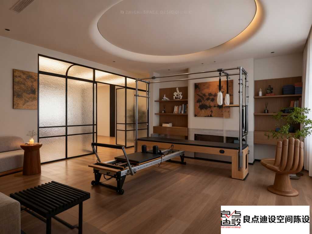 淺木色器械和地板呼應(yīng),金屬配件點(diǎn)綴得恰到好處~既保留了專業(yè)度,又帶著居家般的溫馨感!器械間距留得超合理,轉(zhuǎn)身拉伸都不會(huì)碰到,安全感爆棚!