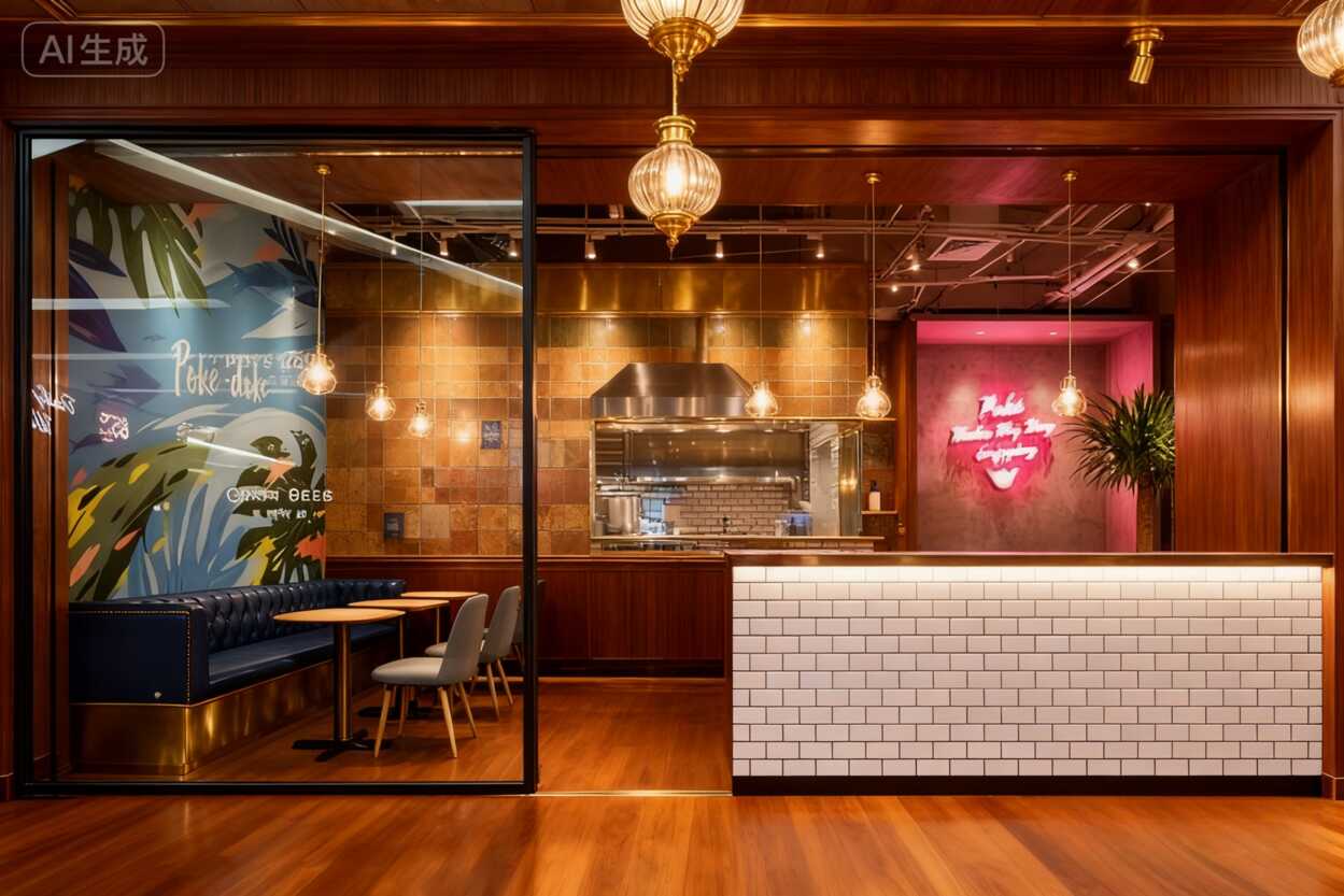 寶子們!今天刷到這家餐廳的軟裝設(shè)計,真的被驚艷到了!白瓷磚墻上掛滿彩色卡片的設(shè)計太絕了——"SALMON""ALOHA"字樣和棕櫚樹圖案隨風(fēng)擺動,瞬間把你拉到夏威夷海邊。深藍(lán)色卡座配木質(zhì)圓桌,色彩碰撞恰到好處,復(fù)古球形燈泡一照,整個空間彌漫著度假般的松弛感!