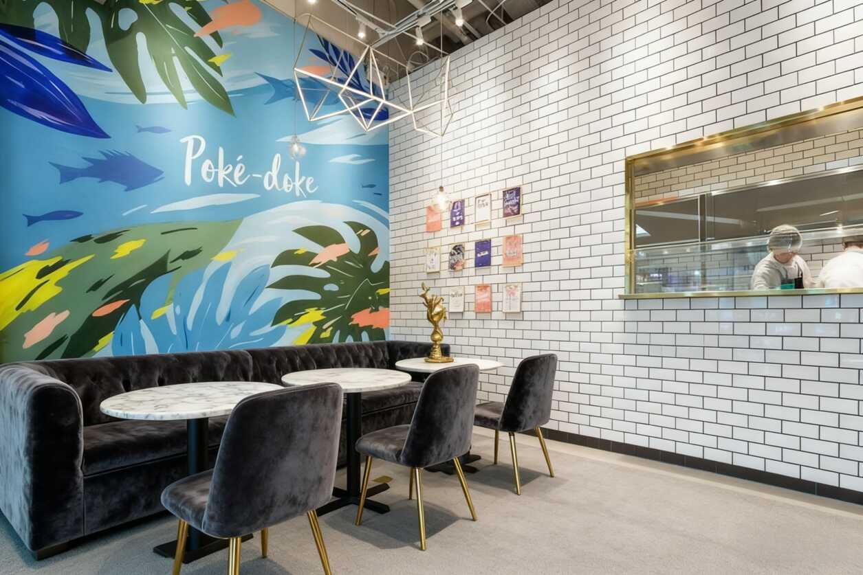 寶子們!今天要安利這家讓我一進(jìn)門就瘋狂拍照的Poke餐廳!白色瓷磚墻搭配黑色工業(yè)風(fēng)管道,簡約中透著高級感,***吸睛的是整面海洋主題壁畫——游動的魚群和棕櫚葉圖案,瞬間把海邊度假氛圍拉滿!