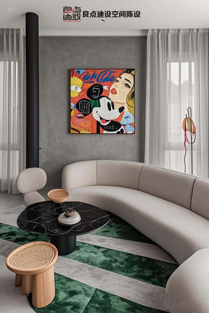 再來說說搭配的弧形沙發(fā)。它就像一個溫柔的懷抱,給人滿滿的安全感。柔和的線條和硬朗的墻面、柱子形成了鮮明的對比,在視覺上產(chǎn)生了強烈的沖擊力。坐上去,柔軟的質(zhì)感包裹著身體,讓人瞬間放松下來。而且弧形的設(shè)計還增加了空間的流動感,讓客廳看起來更加寬敞。想象一下,在忙碌了一天之后,回到家躺在這舒適的沙發(fā)上,看著墻上的畫,所有的疲憊都煙消云散了。