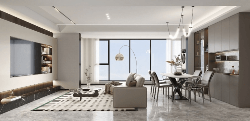 2、客餐廳一體式,選擇三人位沙發(fā)搭配邊椅,更加靈活;以沙發(fā)作為軟隔斷,餐廳根據(jù)家庭需求選擇多人位;