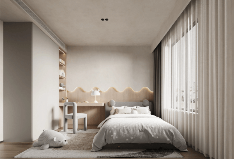 兒童房的設(shè)計(jì),除了要營(yíng)造一種天真爛漫的氛圍外,還需要有休憩功能、學(xué)習(xí)功能和收納功能;采用一體化的定制形式,將衣柜、書柜、書桌做一體化定制,***大化利用空間的同時(shí),滿足多重需求。