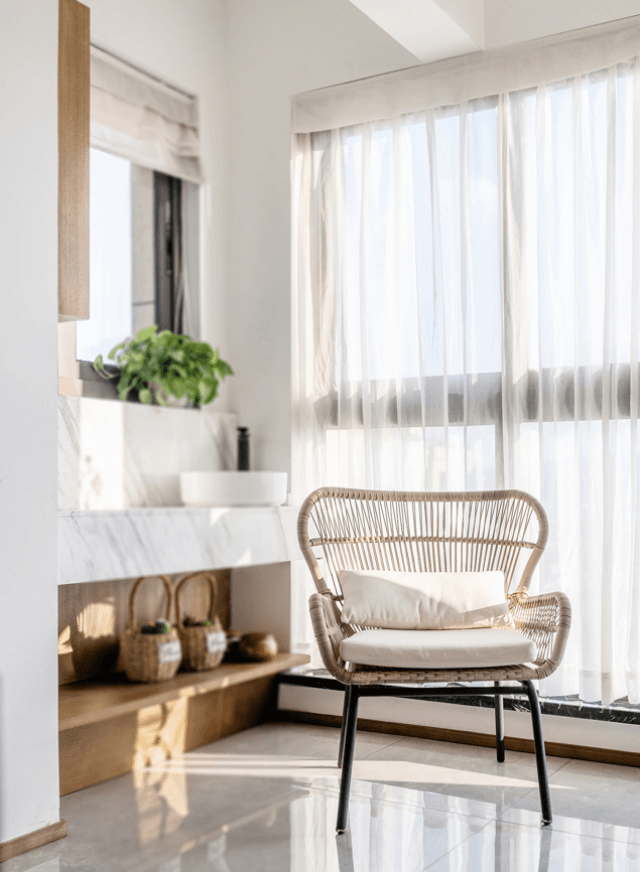 北陽(yáng)臺(tái)作休閑使用。綠植、休閑椅、小茶幾構(gòu)建了一個(gè)小而精致的休閑角,是家中難得的放松空間。如果有好友登門也可來這里小坐,兩人喝喝茶、聊聊天,非常悠閑。
