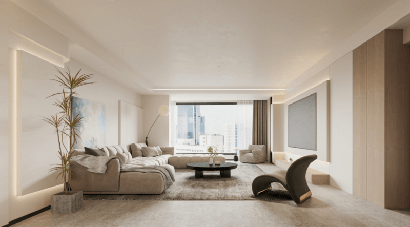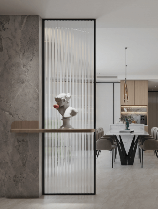 進(jìn)門看見的是客廳,可以兩邊靠墻做頂天立地式收納柜,打造一個(gè)兼具美觀與實(shí)用的入戶空間,既能提升家的顏值,又能為家打造一個(gè)功能區(qū)。如果不考慮儲(chǔ)物,就可以用玻璃作為隔斷。玻璃隔斷不會(huì)影響室內(nèi)采光,還有增加室內(nèi)通透感的作用。
